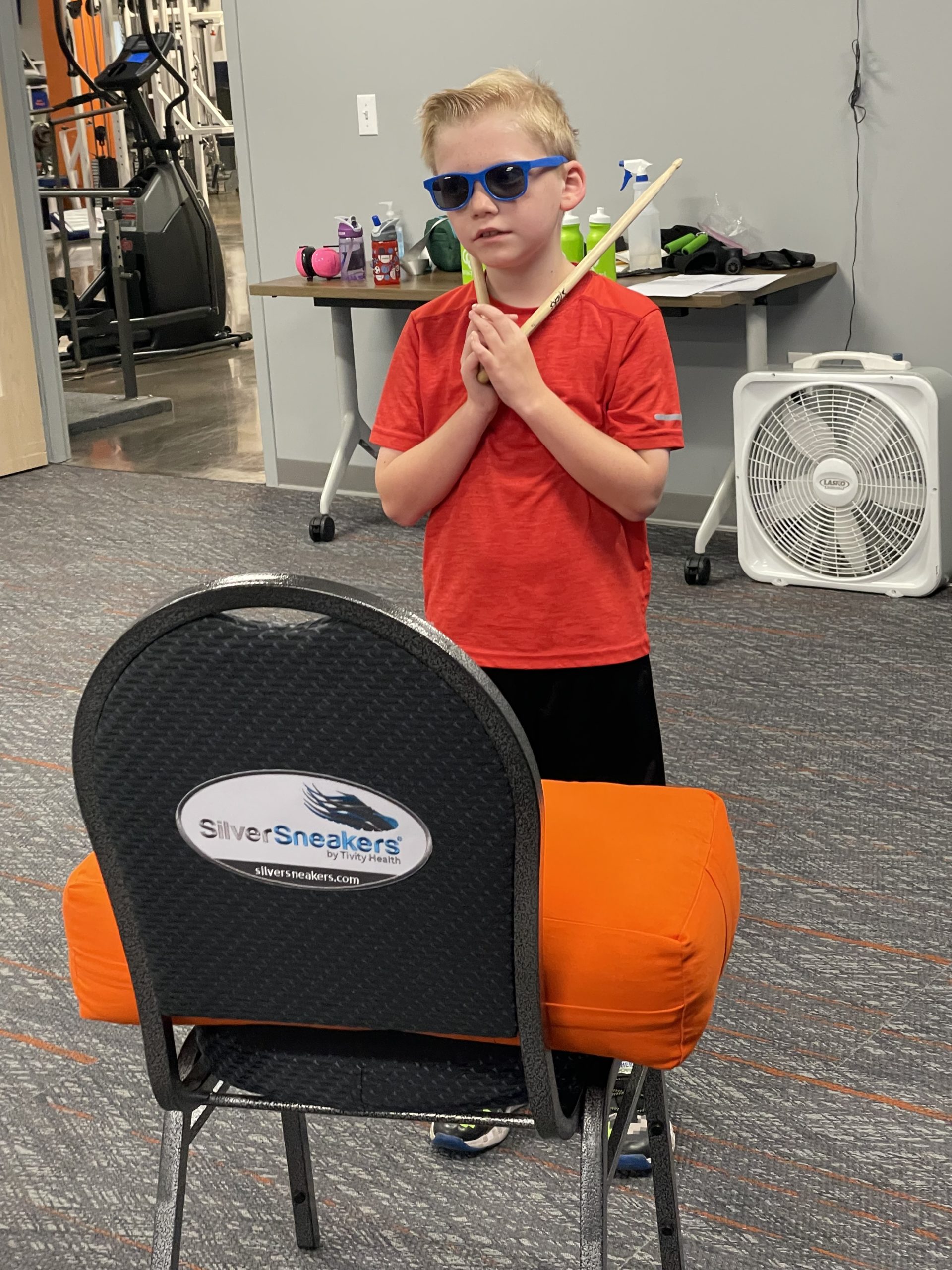 Today we joined Miss Annie at The Orthwein Center for our first (and spirited) session of Cardio Drumming! After introductions were made, Miss Annie began with a warm up, explaining the importance of stretching before a workout. Once warm, she pointed out that while they would be using traditional drum sticks, they would be drumming on chairs and a pillow! Their minds were already opening to new ideas within the first 5 minutes of our session!